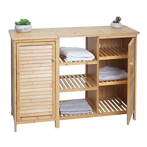 - Lieferumfang: 1x Badregal ohne Deko | Material: Bambus | Ablagefläche | 1x Staufach mit Türe | Magnetischer Türverschluss | Auch im passenden Set erhältlich